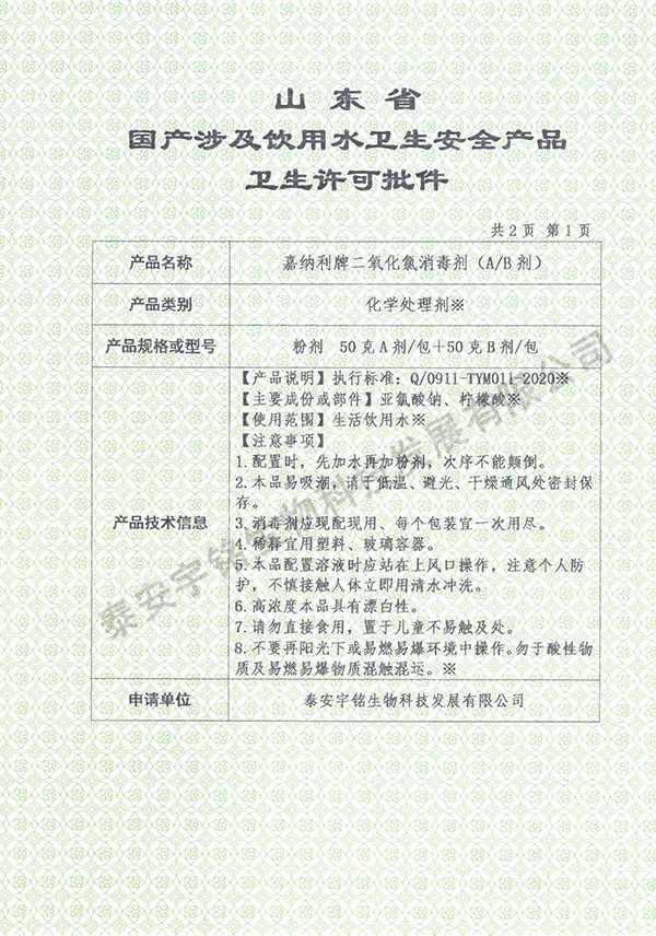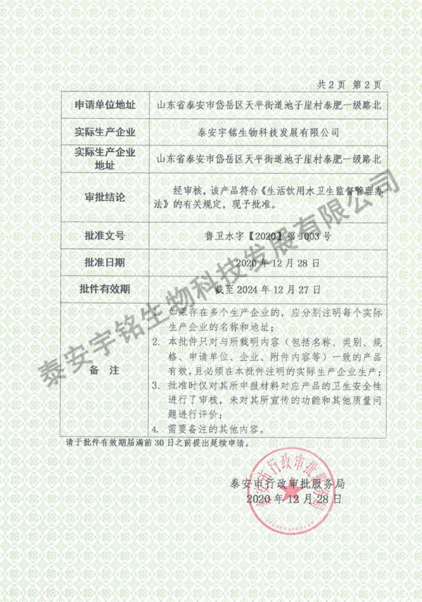 山東省國產(chǎn)涉及飲用水衛(wèi)生安全產(chǎn)品衛(wèi)生許可批件